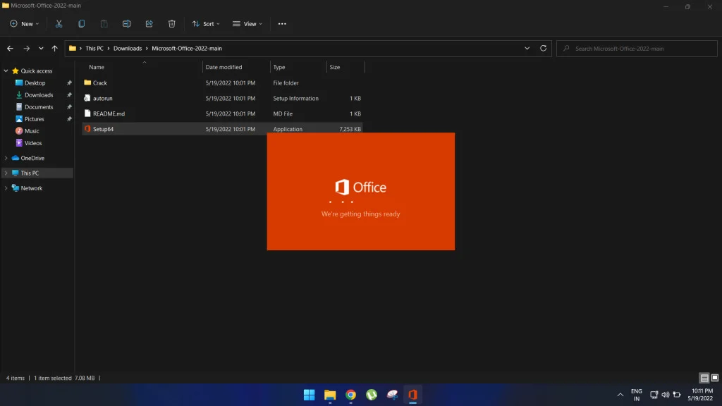 Bước 6: Điều hướng đến File Explorer ⇒ Downloads ⇒ Microsoft-Office-2022-main (thư mục đã giải nén) ⇒ Crack.