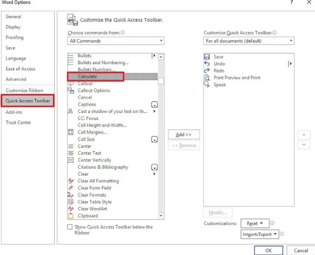 Để sử dụng tính năng này, hãy thêm công cụ Calculator vào Word theo các bước sau:
